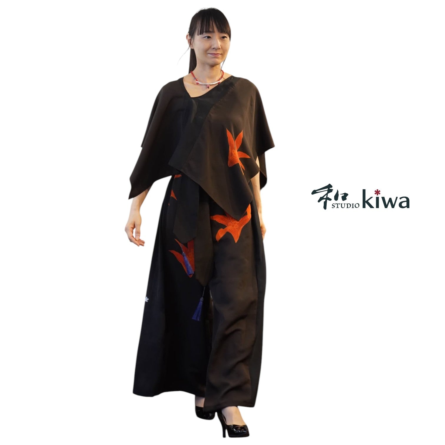 コレクションドレス ポンチョ パンツ セットアップ 羽織 黒紋付 オレンジ花柄のセットアップ